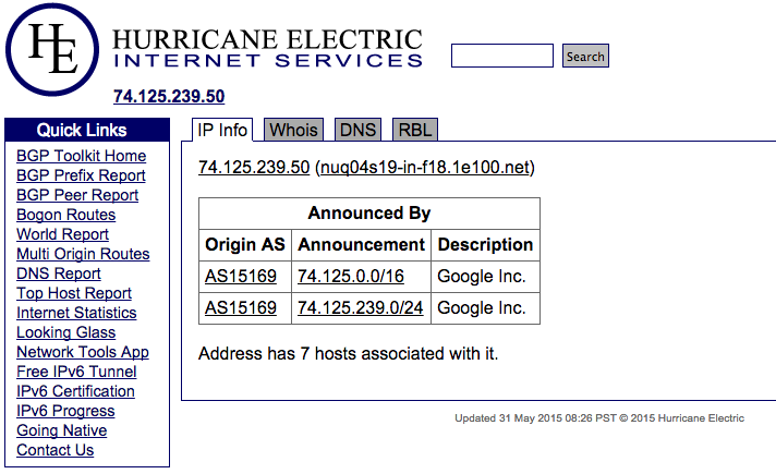 第一步:获取到他的AS number, 这个简单,在香港的router上ping 一下他家的网址,DNS指向香港当地ISP提供给你的DNS, 找到公网地址之后,再去http://bgp.he.net/ 这类的网站去看他家的AS number.