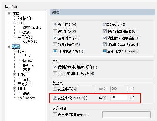 使用SecureCRT连接远程服务器,在会话选项 -> 终端设置中勾选“发送协议 NO-OP”。
