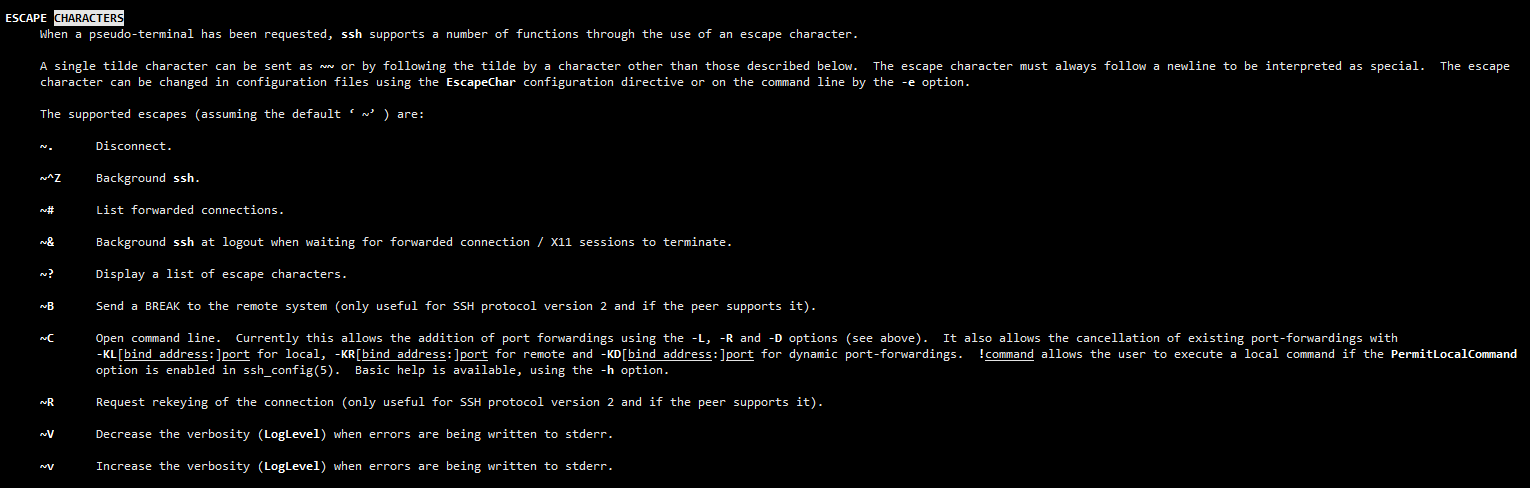 有时我们离开办公桌前忘了退出 ssh 会话,或者工作的时候长时间 ssh 到服务器上忘记断开,之后发现那些没退出的 ssh 会话还挂在那里,无法退出、无法 Ctrl+C、无法做任何操作。通常我们就直接关闭 Terminal 后重新开一个新的;如果用的不是图形系统,没有窗口可以关闭,那还要启用另一个终端找到相关进程后 kill 掉。这里有一个小技巧,在那些没退出的 ssh 会话里用 ~. “优雅” 的断开连接。