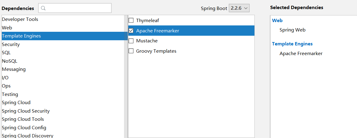 首先整合Freemarker,创建Spring Boot项目引入两个依赖,如下图: