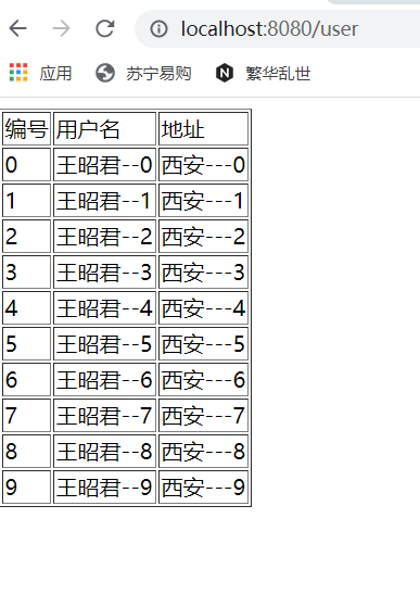 //实体类 package com.bean; public class User { private int id; private String username; private String address; public int getId() { return id; } public void setId(int id) { this.id = id; } public String getUsername() { return username; } //Controller类 package com.controller; import com.bean.User; import org.springframework.stereotype.Controller; import org.springframework.ui.Model; import org.springframework.web.bind.annotation.GetMapping; import java.util.ArrayList; import java.util.List; @Controller public class UserController { @GetMapping("/user") public String user(Model model){ List<User> list = new ArrayList<>(); for (int i = 0; i <10; i++) { User user = new User(); user.setId(i); user.setUsername("王昭君--" + i); user.setAddress("西安---" + i); list.add(user); } model.addAttribute("list",list); return "user"; } //模板Freemaker <!DOCTYPE html> <html lang="en"> <head> <meta charset="UTF-8"> <title>user</title> </head> <body> <table border="1"> <tr> <td>编号</td> <td>用户名</td> <td>地址</td> </tr> <#list list as u> <tr> <td>${u.id}</td> <td>${u.getUsername()}</td> <td>${u.getAddress()}</td> </tr> </#list> </table> </body> </html>