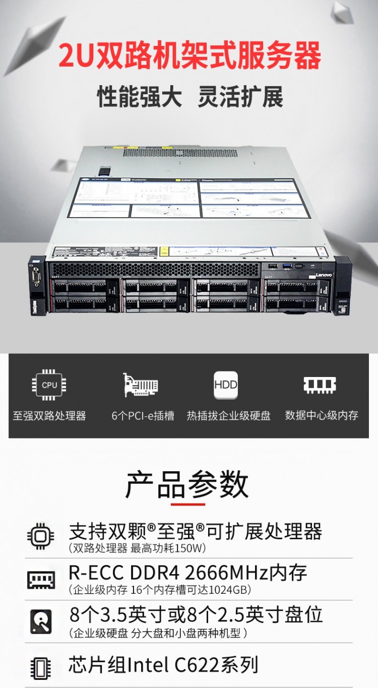 【原厂工程师推荐配置】:Lenovo ThinkSystem SR550,2U机架式服务器,1*英特尔 至强 银牌 4110 处理器 (8C, 2.10 GHz),可支持2颗CPU,1*16GB TruDDR4 2666 MHz (1Rx4 1.2V) RDIMM,支持12个DDR4内存插槽,1*3.5" 2TB 7.2K SAS 12Gbps 热插拔硬盘 , 标配支持8个3.5"硬盘背板插槽,标配RAID 530-8i PCIe 12Gbps 阵列卡(支持8个硬盘)支持RAID0/1/10/5/50,标配2个集成1GbE RJ-45网口(LOM卡)1个管理网络端口,支持6个PCIe 3.0插槽,标配1个550W白金级热插拔电源模块,支持2个,前置1个USB2.0(XClarity管理接口),1个USB3.0接口,光通路诊断LED报警灯,2U机架,3年有限保修&基础安装