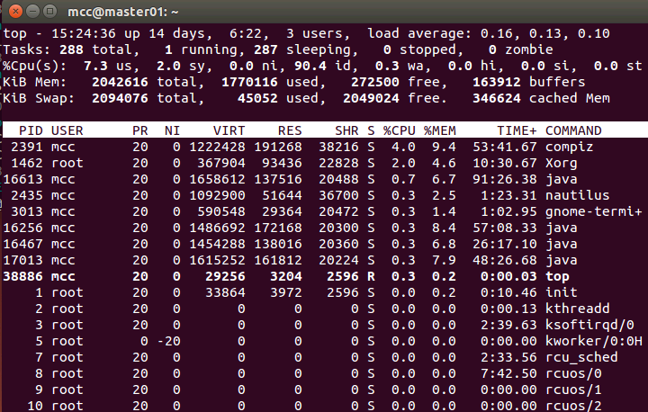 以 PID 区分的进程列表将根据所设定的画面更新时间定期的更新。通过 top 内部命令可以控制此处的显示方式: