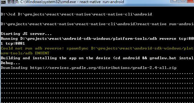 react-native init android,此操作同样会持续很长时间,根据网络而定,本人是单位执行了一个下午没反应,删除文件后到宿舍重新执行,一切才OK