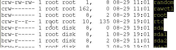 每个设备文件都有其文件属性(c或者b),使用ls /dev -l 的命令查看,