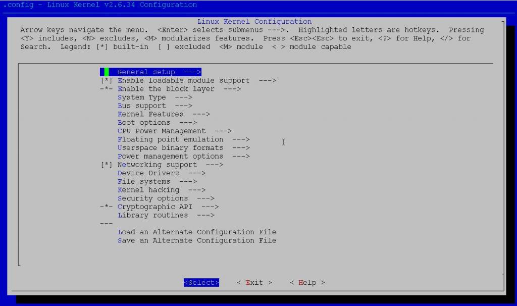 我们在进行linux内核配置的时候经常会执行make menuconfig这个命令,然后屏幕上会出现以下界面: