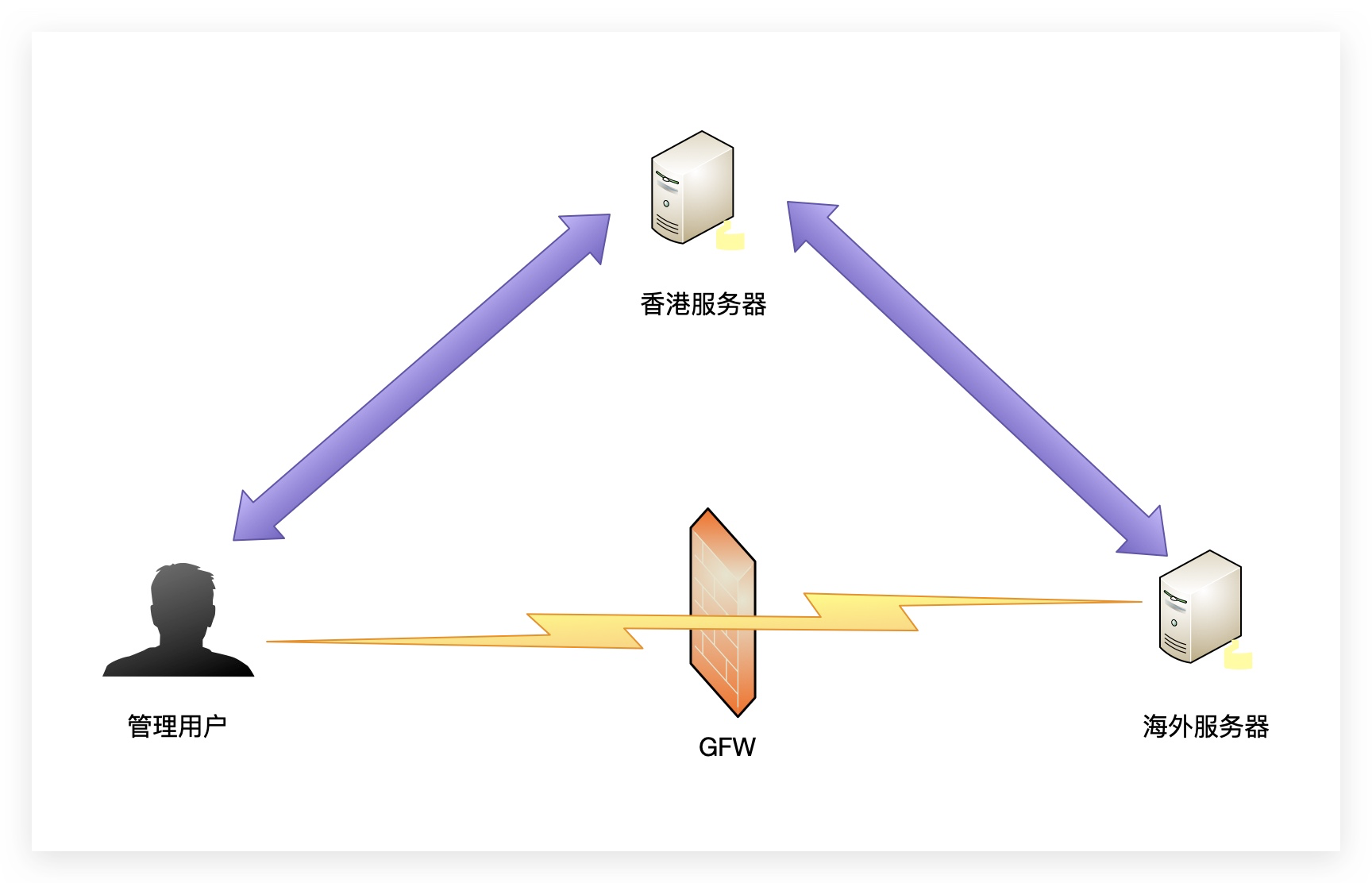 - 新增一台代理服务器,此服务器到用户的网络质量和到海外服务器的网络质量良好,可以充当中间桥梁,途中我们以香港服务器为例。