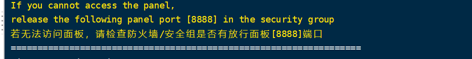 4.安装完成后,会出现面板地址及默认账号与密码。访问ip:8888,输入账号与密码即可使用宝塔