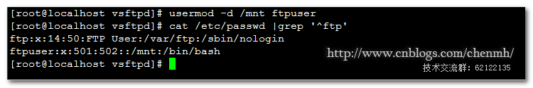 创建用户ftpuser useradd ftpusr 设置用户只能ftp不能登入 usermod -s /sbin/nologin ftpuser 设置用户密码 passwd ftpusr