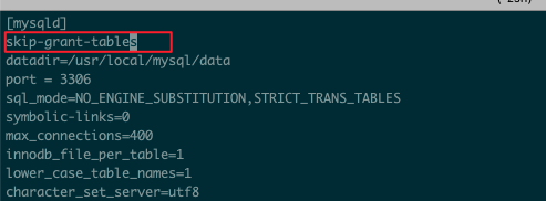 2、修改/etc/my.cnf 文件,增加 skip-grant-tables ,作用是登陆是跳开密码校验