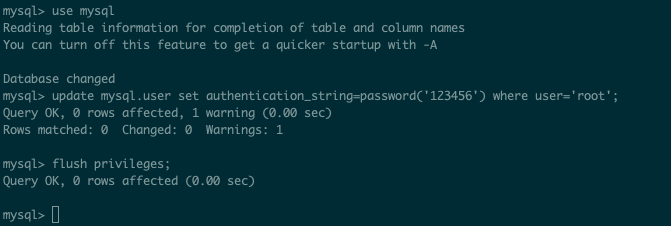 update mysql.user set authentication_string=password(‘123456′) where user=’root’;