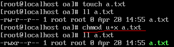 先创建一个文件a.txt,此时a.txt文件拥有者是没有执行权限,我们可以给它加上执行权限(x),u就是代表文件拥有者。