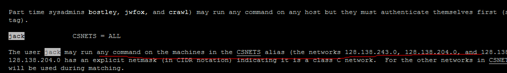 格式解释: 用户名(给哪个用户赋予权限,这里是root) 被管理的主机地址(第一个ALL)= (可使用身份(第二个ALL),这个可以省略直接跟授权的命令) 授权的命令(要写绝对路径,命令写的越简单权限就越大,越详细普通用户获得权限就越小)