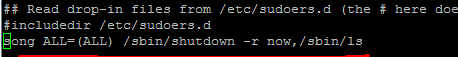 [song@localhost ~]$ sudo -l 匹配此主机上 song 的默认条目: requiretty, !visiblepw, always_set_home, env_reset, env_keep="COLORS DISPLAY HOSTNAME HISTSIZE INPUTRC KDEDIR LS_COLORS", env_keep+="MAIL PS1 PS2 QTDIR USERNAME LANG LC_ADDRESS LC_CTYPE", env_keep+="LC_COLLATE LC_IDENTIFICATION LC_MEASUREMENT LC_MESSAGES", env_keep+="LC_MONETARY LC_NAME LC_NUMERIC LC_PAPER LC_TELEPHONE", env_keep+="LC_TIME LC_ALL LANGUAGE LINGUAS _XKB_CHARSET XAUTHORITY", secure_path=/sbin:/bin:/usr/sbin:/usr/bin 用户 song 可以在该主机上运行以下命令: (ALL) /sbin/shutdown -r now, (ALL) /sbin/ls