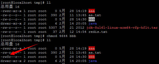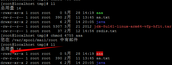 红色箭头那里之前x变成了s,表示aaa文件拥有了s权限,同时aaa文件也变成了红色,表示不安全。