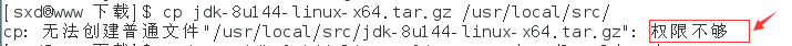 cp拷贝文件的时候,出现了权限不够的问题,也就解释了为什么刚刚上面查看JDK压缩文件的时候,文件名是红色的。
