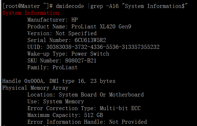 [root@Master ~]# dmidecode|grep “System Information” -A9|egrep “Manufacturer|Product|Serial”