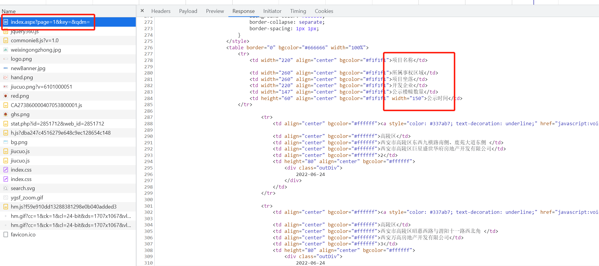 再点击项目名称,进入楼幢信息页面,又会请求一堆资源,有用的还是第一个接口: