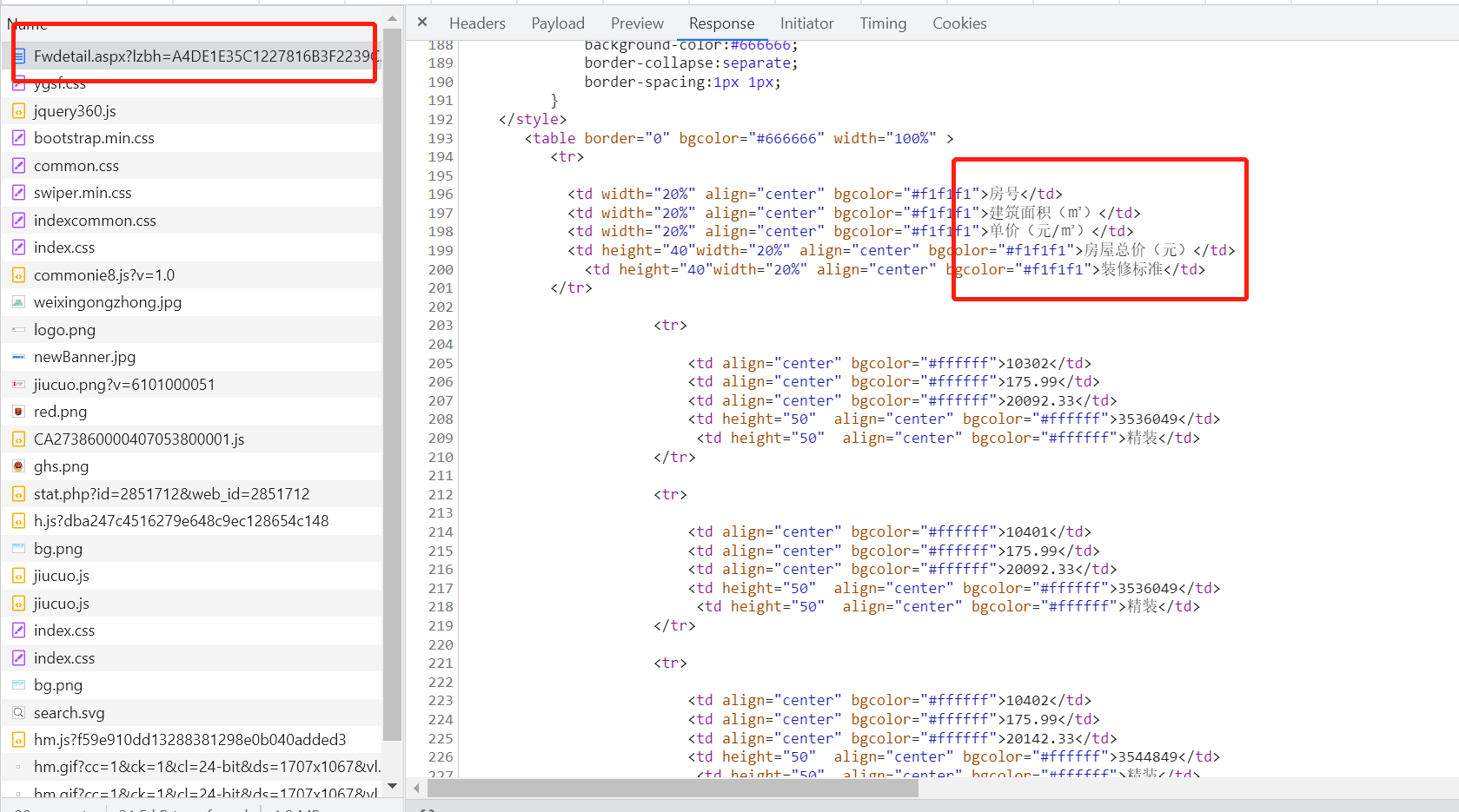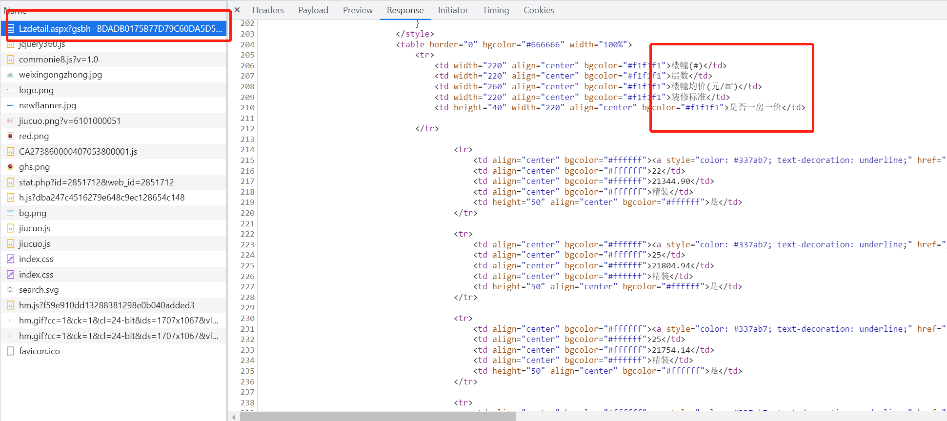 于是我再点击楼幢号,进入房屋信息界面,依然请求了一堆资源,依然看第一个接口: