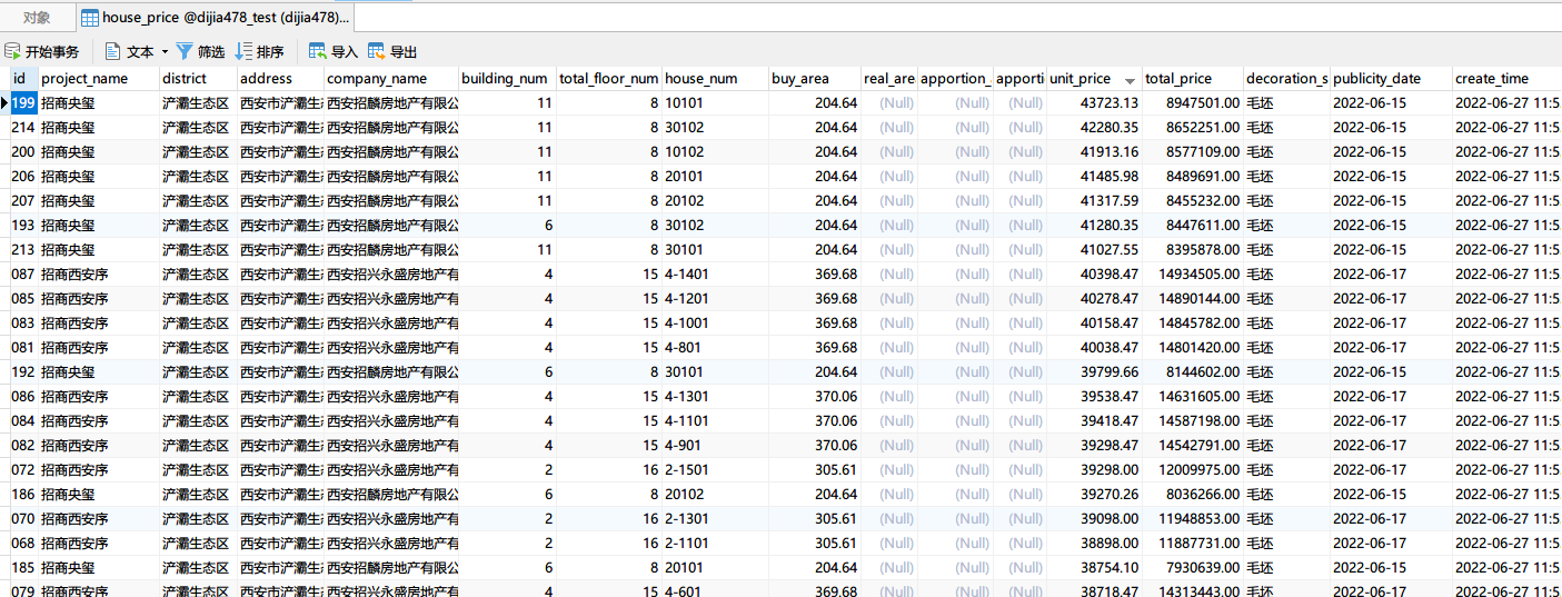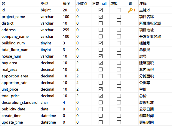 其实从业务模型上来说,应该是有三张表才对:项目表、楼幢表、房屋表。但是因为我懒,所以一个大宽表全部存起来,数据冗余就冗余吧,对数据库来说数据量很小,问题不大。