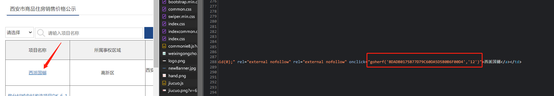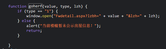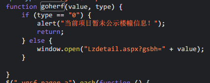 如上图所示,当点击项目名称的时候,会去调用 goherf 方法,这个方法有两个参数。第一个简单,应该就是项目编号ID,是打开楼幢信息页面所需要的参数之一。可第二个参数是什么呢?我们去看看方法里面: