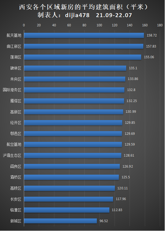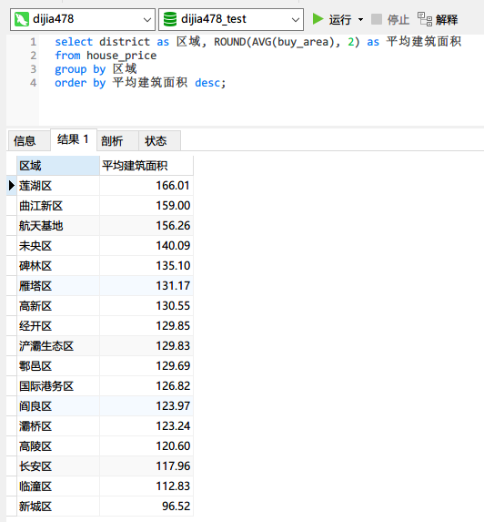 统计各个区域新房的平均建筑面积,由高到低排序: