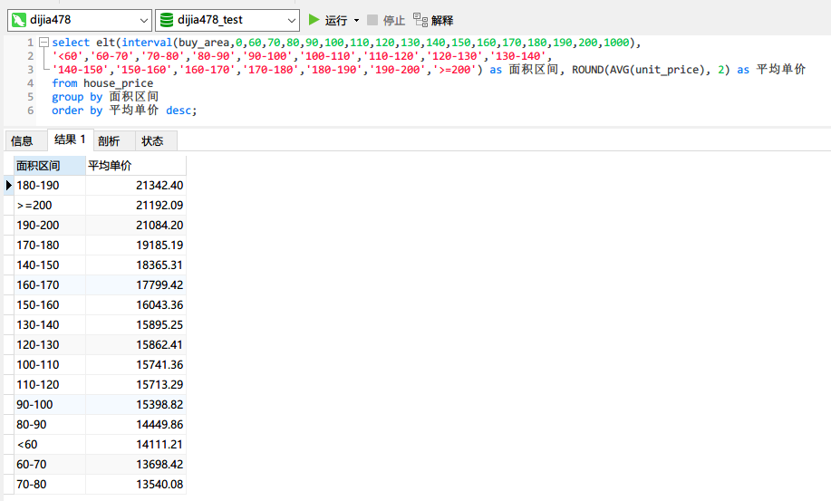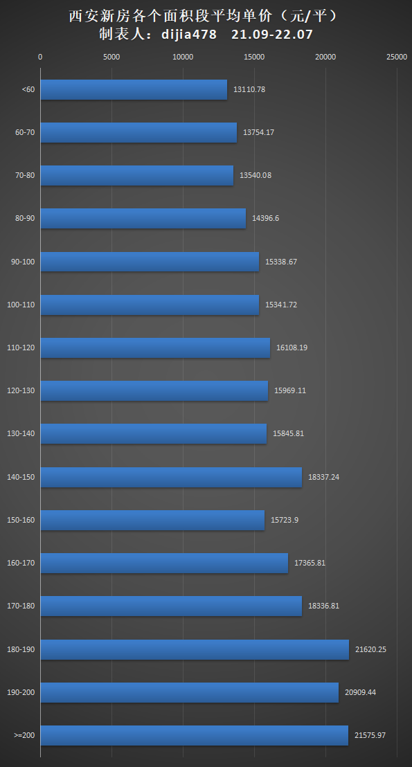 统计西安新房中,各个面积段的平均单价,由高到低排序:
