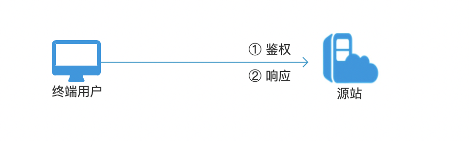 在使用CDN前,一般鉴权和响应均在源站完成。如下图,当终端用户对资源发起请求时,请求到达源站先校验是否符合权限控制规则,如果鉴权通过,源站再响应终端用户所请求的内容。
