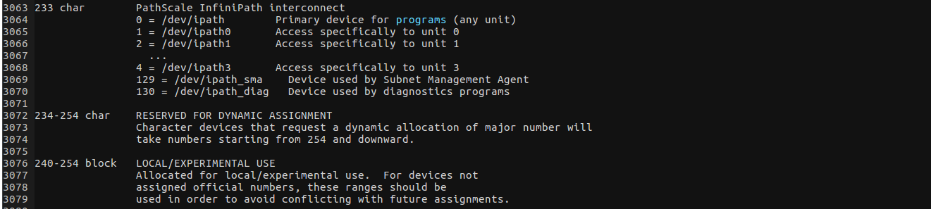 罗嗦一句,如果使用静态申请设备号,那么最大的问题就是不要与已知的设备号相冲突,内核在文档“Documentation/devices.txt”中已经注明了哪些主设备号被使用了,从中可以看出,在212个主设备号中,我们能够使用的范围是<u>240-255以及261-212-1的部分,这也可以解释为什么我们动态申请的时候,设备号经常是250的原因。此外,通过这个文件,我们也可以看出,”主设备号表征一类设备”,但是字符/块设备本身就可以被分为好多类,所以内核给他们每一类都分配了主设备号。