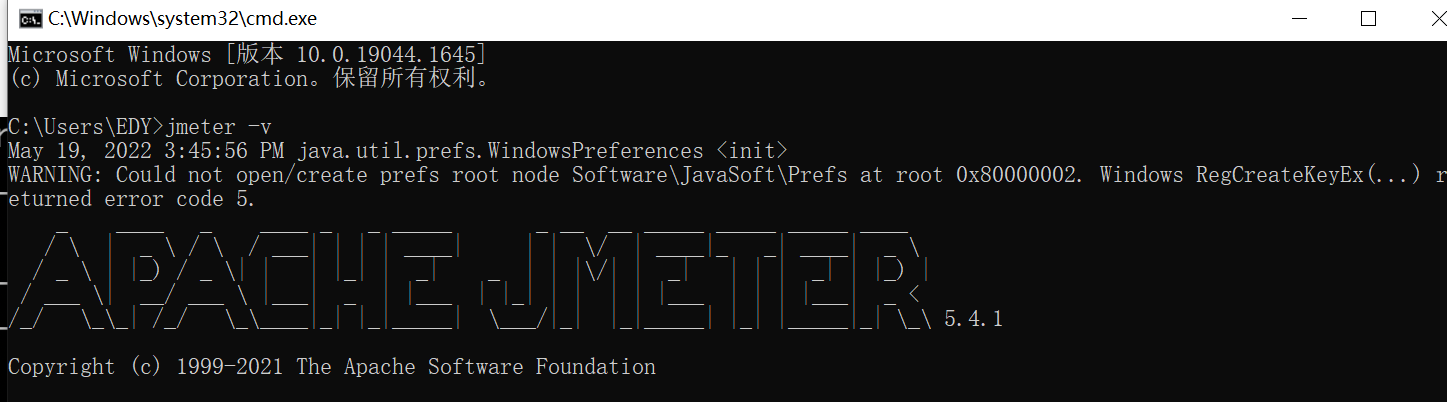 打开cmd控制台,输入命令jmeter -v,出现以下就是环境搭建好了