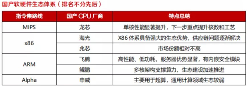 国产 CPU 厂商得到了相应指令集的架构授权,发展成为6大主流厂商:龙芯、飞腾、鲲鹏、海光、申威、兆芯。CPU 的指令集分为复杂指令集(CISC)和精简指令集(RISC)两大类。复杂指令集以x86架构为代表,精简指令集则包括 ARM、MIPS、Alpha、Power 等。