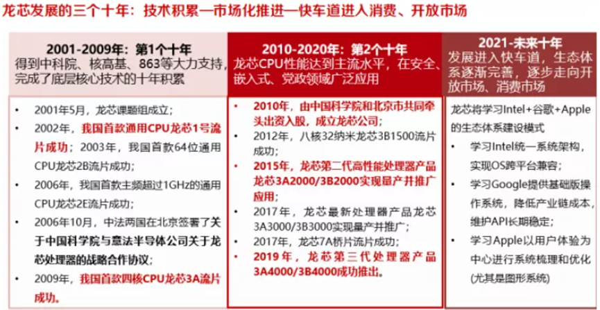 龙芯技术源于中科院计算产业,沿着市场化的道路不断发展,已有超过 20 多年的 CPU 行业积累。2001 年,在中科院计算所知识创新工程的支持下,龙芯课题组正式成立。2010 年,龙芯公司正式成立。龙芯坚持“市场带技术”的道路,而不是“市场换技术”的道路,坚持自主研发,坚持市场化的机制,整体的发展可概况为三个十年。