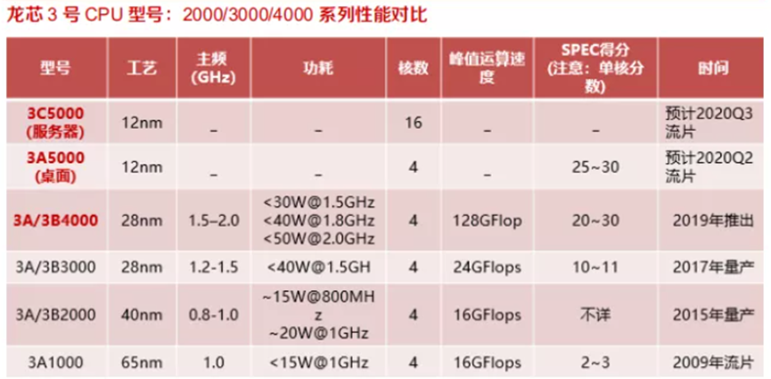龙芯 3A4000相比 3000,采用相同工艺(28nm)但性能成倍提高;龙芯 5000 系列工艺更新 12nm。龙芯 3 号 CPU 下一代 5000 系列的目标:提高主频和核数。龙芯新一代桌面芯片 3A5000 将在2020年Q2 流片,采用 12nm 工艺,单核性能提高至 25-30 分,与 3A4000 可原位替换,操作系统二进制兼容;龙芯服务器芯片 3C5000 预计于 2020 三季度流片,采用 12nm工艺,16 核结构,支持 4-16 路服务器。