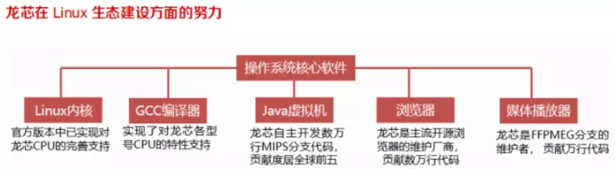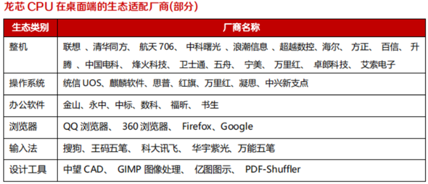 PC 端的生态建设:龙芯 CPU 已经支持主流的整机、操作系统、办公软件、浏览器、输入法和部分设计工具等常见软硬件,覆盖了基本的办公需求。