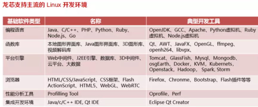 在应用开发环境建设方面,龙芯支持主流的 Linux 开发环境,包括多种编程语言、函数库、平台引擎和集成开发工具等。