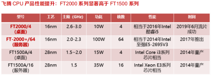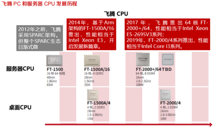 2)新篇章:基于 ARM 架构(2014-至今),性能显著提升、生态建设顺利推进。2014 年飞腾基于ARM 架构的 FT-1500A 推出,性能相当于 Intel Xeon E3,从此开启了技术发展的新篇章。2017年,飞腾推出 64 核的 FT-2000+系列。2019 年,飞腾桌面版 FT-2000/4 问世,采用 16nm 工艺,性能相当于 Intel Core i3 系列。