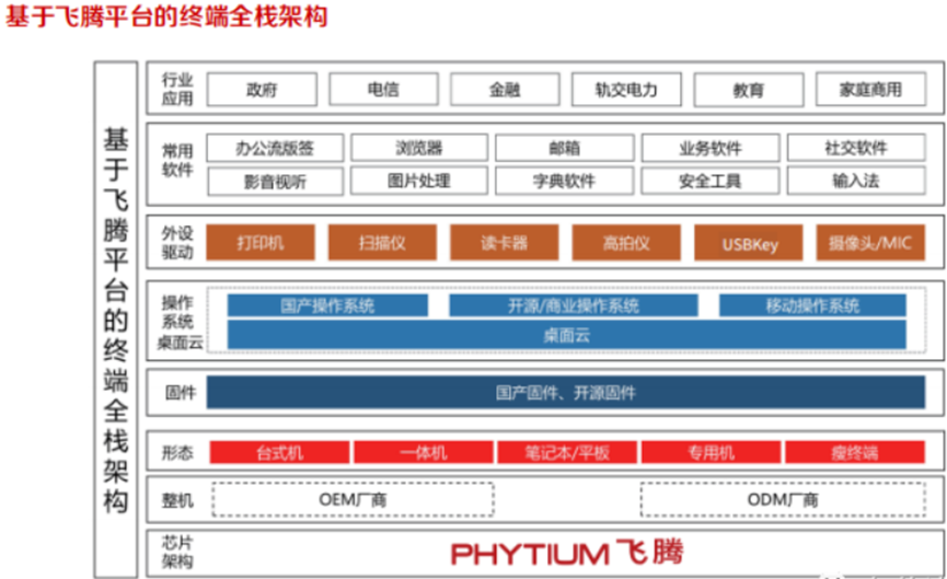 生态建设:飞腾通过性能强大、低功耗的桌面 CPU,构建了终端全栈生态。终端全栈架构包括硬件层,固件、操作系统及驱动层和应用层。