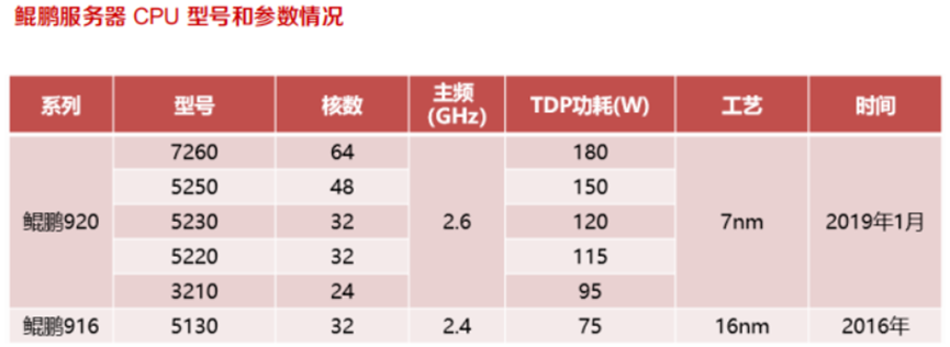 在通用计算领域,鲲鹏 CPU 目前主要集中在服务器领域。鲲鹏 920 服务器 CPU 基于 ARM V8 多核架构,最高集成 64 个物理核,主频最高 2.6GHz,通过多核来提升算力。另外,华为鲲鹏 PC 级 的 CPU 也在规划中。