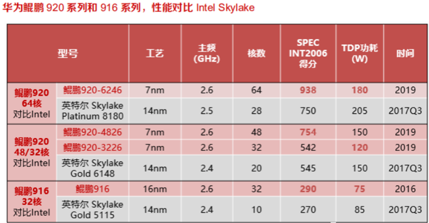 根据华为开发者大会 2020(cloud)公布的数据,相比英特尔 Skylake 服务器 CPU,华为鲲鹏 920 系列芯片的性能更高,功耗更低,主要得益于鲲鹏 920 的工艺升级到了 7nm,内核数量更多,而且进行了多核优化处理。