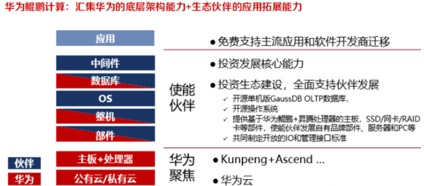 鲲鹏生态加速推进:华为聚焦于架构和并发,提供算力;硬件开放、软件开源、支持迁移和生态伙伴共建生态。在华为开发者大会 2020(Cloud)上,华为宣布“沃土计划 2.0” ,将在 2020 年投入 2 亿美元推动鲲鹏计算产业发展,并公布面向高校、初创企业、开发人员及合作伙伴的扶持细则。
