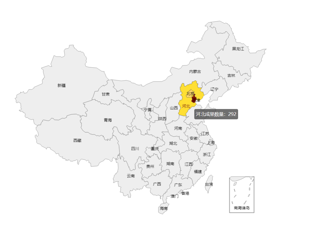 <%@ page language="java" contentType="text/html; charset=UTF-8" pageEncoding="UTF-8"%> <!DOCTYPE html> <html style="height: 100%"> <head> <meta charset="UTF-8"> <title>科技成果地图</title> <script type="text/javascript" src="https://cdn.jsdelivr.net/npm/echarts/dist/echarts.min.js"></script> <script type="text/javascript" src="https://cdn.jsdelivr.net/npm/echarts/dist/extension/dataTool.min.js"></script> <script type="text/javascript" src="https://cdn.jsdelivr.net/npm/echarts/map/js/china.js"></script> <script type="text/javascript" src="js/jquery-3.3.1.js"></script> </head> <body style="height: 100%; margin: 0"> <div> <jsp:include page="menu.jsp"></jsp:include> </div> <div id="ditu" style="height:100%"></div> <script type="text/javascript"> $(function() { $.get('${pageContext.request.contextPath}/servlet?method=search', function(data) { // alert("123") init(data); // alert("1234") //alert(data); }); }); function init(data) { //alert(data) var allData=data; var dom = document.getElementById("ditu"); var myChart = echarts.init(dom); var app = {}; option = null; //各省份的地图json文件 var provinces = { '上海': 'ss/data-1482909900836-H1BC_1WHg.json', '河北': 'ss/data-1482909799572-Hkgu_yWSg.json', '山西': 'ss/data-1482909909703-SyCA_JbSg.json', '内蒙古': 'ss/data-1482909841923-rkqqdyZSe.json', '辽宁': 'ss/data-1482909836074-rJV9O1-Hg.json', '吉林': 'ss/data-1482909832739-rJ-cdy-Hx.json', '黑龙江': 'ss/data-1482909803892-Hy4__J-Sx.json', '江苏': 'ss/data-1482909823260-HkDtOJZBx.json', '浙江': 'ss/data-1482909960637-rkZMYkZBx.json', '安徽': 'ss/data-1482909768458-HJlU_yWBe.json', '福建': 'ss/data-1478782908884-B1H6yezWe.json', '江西': 'ss/data-1482909827542-r12YOJWHe.json', '山东': 'ss/data-1482909892121-BJ3auk-Se.json', '河南': 'ss/data-1482909807135-SJPudkWre.json', '湖北': 'ss/data-1482909813213-Hy6u_kbrl.json', '湖南': 'ss/data-1482909818685-H17FOkZSl.json', '广东': 'ss/data-1482909784051-BJgwuy-Sl.json', '广西': 'ss/data-1482909787648-SyEPuJbSg.json', '海南': 'ss/data-1482909796480-H12P_J-Bg.json', '四川': 'ss/data-1482909931094-H17eKk-rg.json', '贵州': 'ss/data-1482909791334-Bkwvd1bBe.json', '云南': 'ss/data-1482909957601-HkA-FyWSx.json', '西藏': 'ss/data-1482927407942-SkOV6Qbrl.json', '陕西': 'ss/data-1482909918961-BJw1FyZHg.json', '甘肃': 'ss/data-1482909780863-r1aIdyWHl.json', '青海': 'ss/data-1482909853618-B1IiOyZSl.json', '宁夏': 'ss/data-1482909848690-HJWiuy-Bg.json', '新疆': 'ss/data-1482909952731-B1YZKkbBx.json', '北京': 'ss/data-1482818963027-Hko9SKJrg.json', '天津': 'ss/data-1482909944620-r1-WKyWHg.json', '重庆': 'ss/data-1482909775470-HJDIdk-Se.json', '香港': 'ss/data-1461584707906-r1hSmtsx.json', '澳门': 'ss/data-1482909771696-ByVIdJWBx.json' }; loadMap('ss/data-1527045631990-r1dZ0IM1X.json', 'china');//初始化全国地图 var timeFn = null; //单击切换到省级地图,当mapCode有值,说明可以切换到下级地图 myChart.on('click', function(params) { clearTimeout(timeFn); //由于单击事件和双击事件冲突,故单击的响应事件延迟250毫秒执行 timeFn = setTimeout(function() { var name = params.name; //地区name var mapCode = provinces[name]; //地区的json数据 if (!mapCode) { alert('无此区域地图显示'); return; } loadMap(mapCode, name); }, 250); }); // 绑定双击事件,返回全国地图 myChart.on('dblclick', function(params) { //当双击事件发生时,清除单击事件,仅响应双击事件 clearTimeout(timeFn); //返回全国地图 loadMap('ss/data-1527045631990-r1dZ0IM1X.json', 'china'); }); /** 获取对应的json地图数据,然后向echarts注册该区域的地图,最后加载地图信息 @params {String} mapCode:json数据的地址 @params {String} name: 地图名称 */ function loadMap(mapCode, name) { $.get(mapCode, function(data) { if (data) { echarts.registerMap(name, data); var option = { tooltip: { show: true, formatter: function(params) { if (params.data) return params.name + '成果数量:' + params.data['value'] }, }, visualMap: { min: 0, max: 1000, left: 26, bottom: 40, showLabel: !0, text: ["多", "少"], pieces: [{ gt: 1000, label: "> 1000 ", color: "#7f1100" }, { gte: 501, lte: 1000, label: "500 - 1000 ", color: "#ff5428" }, { gte: 101, lt: 500, label: "100 - 500 ", color: "#ffd768" }, { gt: 11, lt: 100, label: "10 - 100", color: "#ff8c71" }, { gt: 0, lt: 10, label: "0 - 10", color: "#FFF0F5" }], show: !0 }, series: [{ name: 'MAP', type: 'map', mapType: name, selectedMode: 'false',//是否允许选中多个区域 label: { normal: { show: true }, emphasis: { show: true } }, data: allData }] }; myChart.setOption(option); // curMap = { // mapCode: mapCode, // mapName: name // }; } else { alert('无法加载该地图'); } }); }; if (option && typeof option === "object") { myChart.setOption(option, true); } } </script> </body> </html>