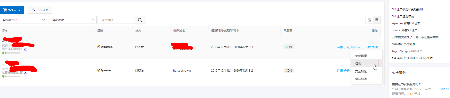 2 申请免费版的ssl证书,参考文章https://yq.aliyun.com/articles/637307 , 等待证书审批下来之后,点击部署选择cdn