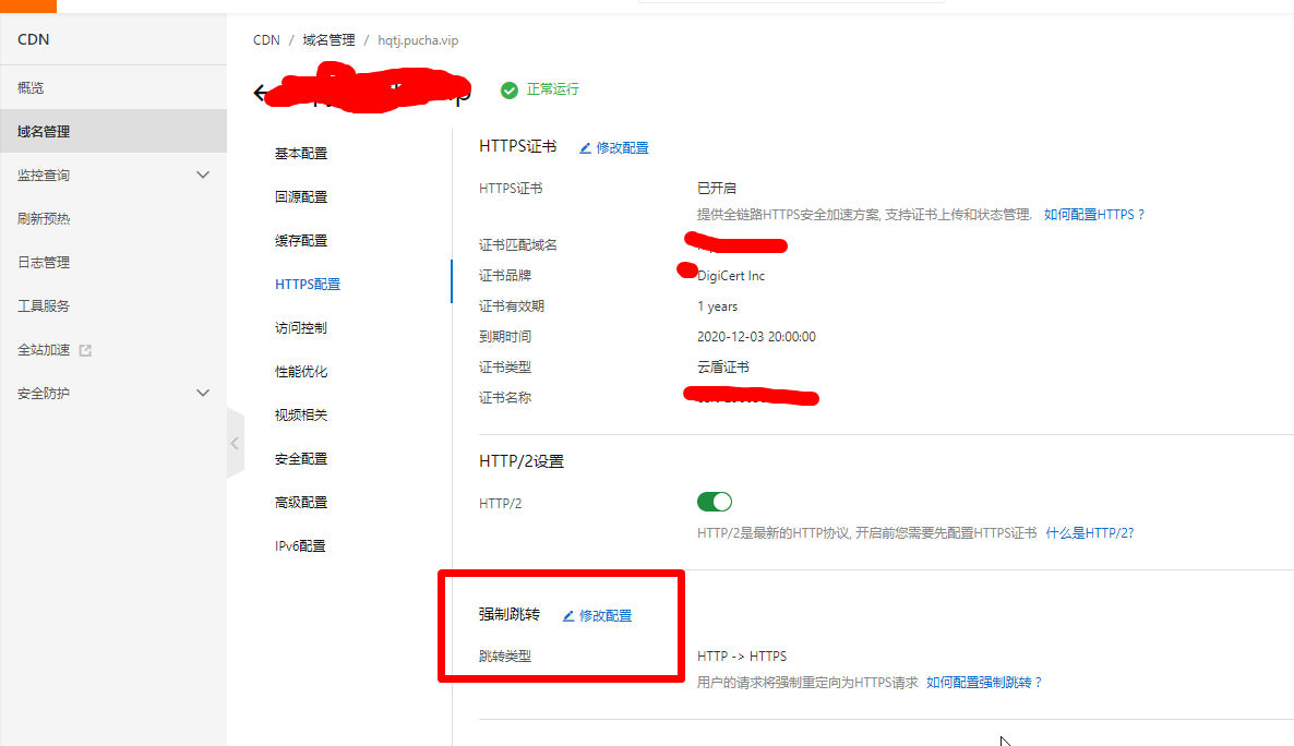 4 配置https 强制跳转 http->https 。这样再次访问网站时,输入域名会通过一次重定向使用https解析。