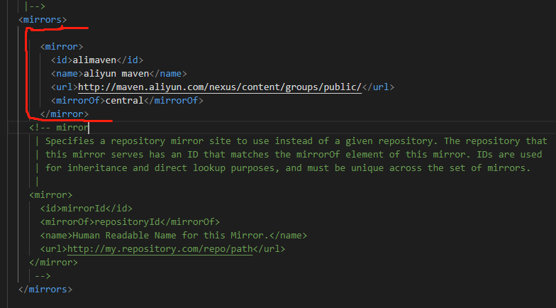<mirror> <id>alimaven</id> <name>aliyun maven</name> <url>http://maven.aliyun.com/nexus/content/groups/public/</url> <mirrorOf>central</mirrorOf> </mirror>