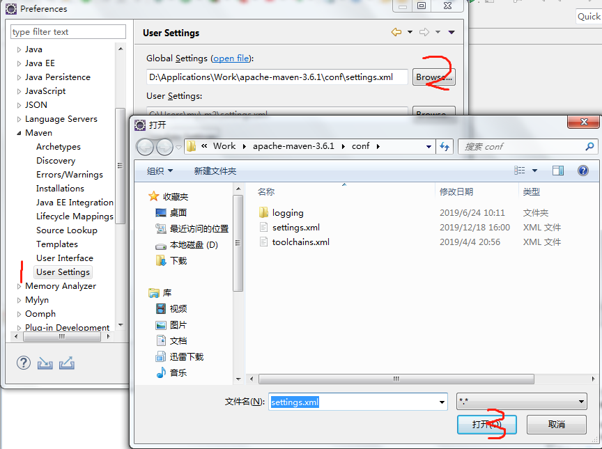 拿到安装位置 D:ApplicationsWorkapache-maven-3.6.1 后打开该位置下的conf文件夹,找到一个叫settings.xml的文件。