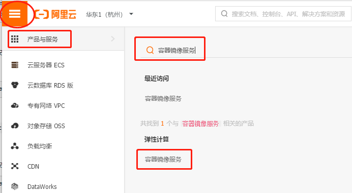 (3)点击左上角的功能菜单图标,点击【产品与服务】,在产品服务搜索框里输入【容器镜像服务】,点击【弹性计算】下面的【容器镜像服务】,进入【镜像中心】设置页面。