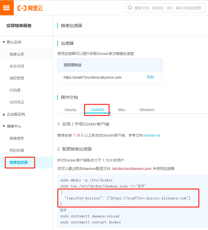 点击【容器镜像服务】 进入 【镜像中心】 【镜像加速器】 页面。