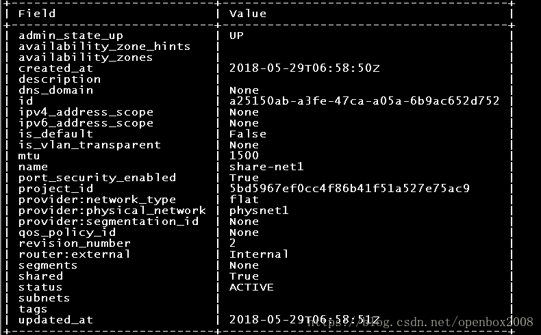 #openstack network create –project $PROID –share –provider-network-type flat –provider-physical-network physnet1 share-net1