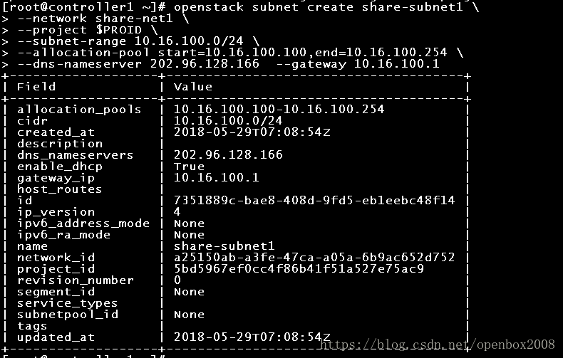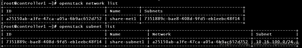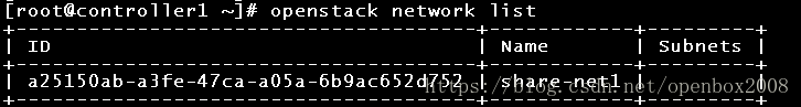 [root@controller1 ~]# openstack network create –project $PROID –share –provider-network-type flat –provider-physical-network physnet1 share-net1