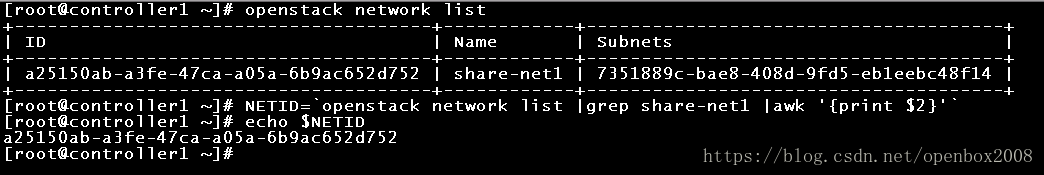 NETID=`openstack network list |grep share-net1 |awk '{print $2}'`